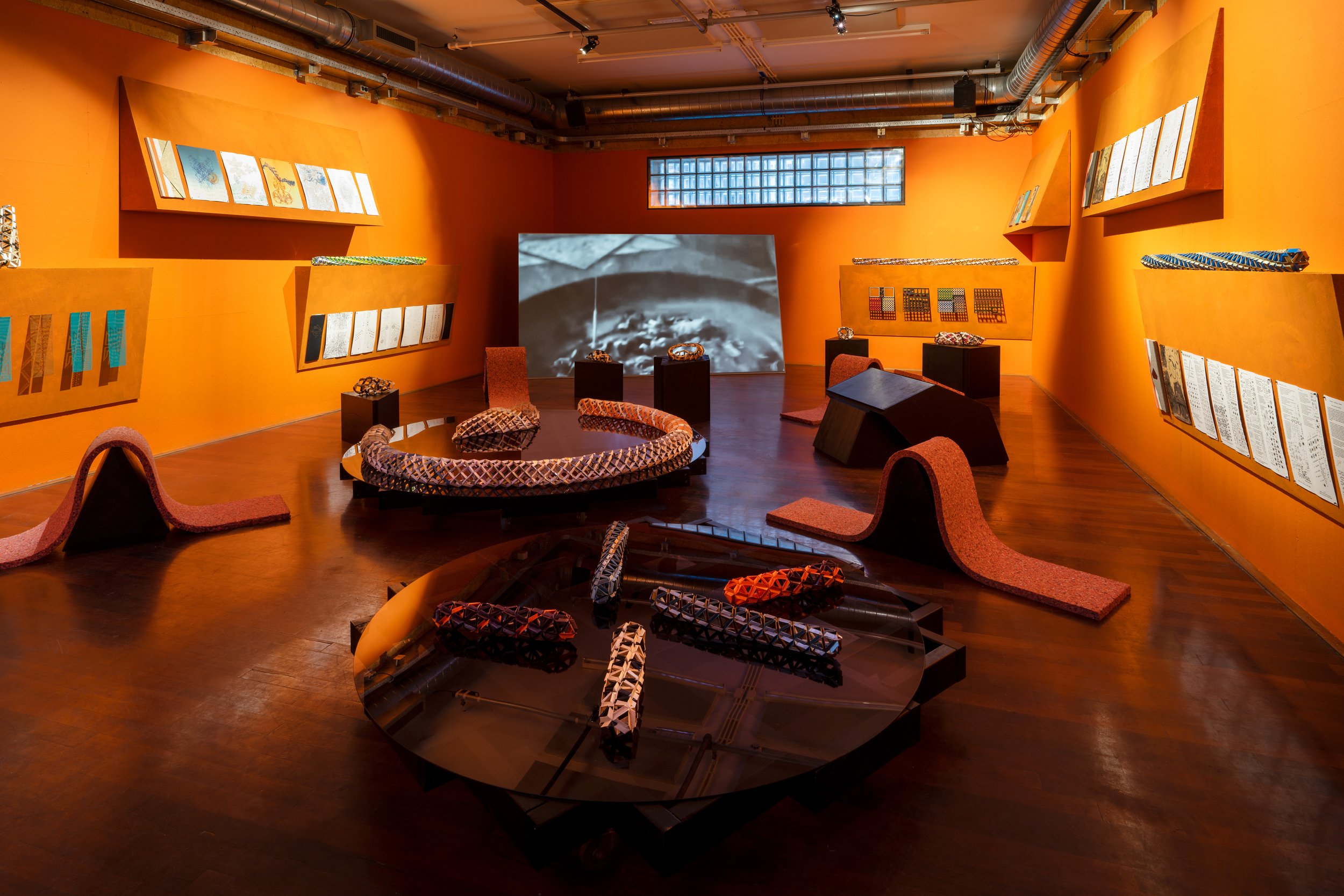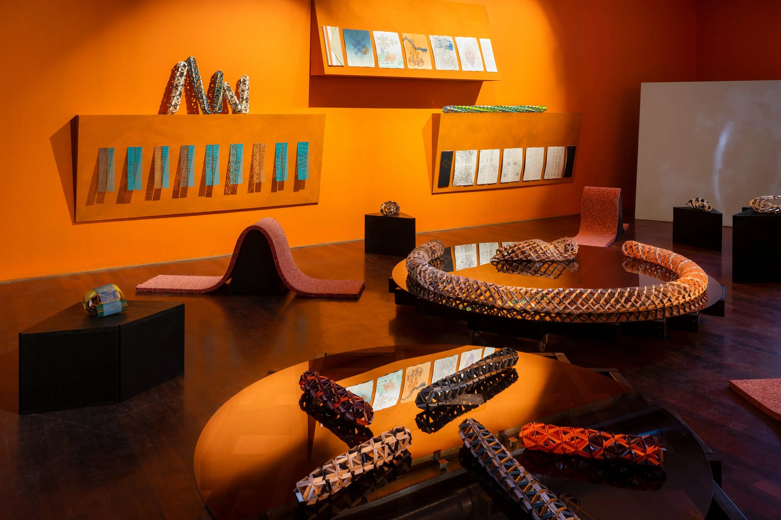 Hand pulled etchings, lithographs, letterpress printed poems, single-channel video installation, hand folded metallic and fluorescent offset printed paper joints, black lumber, polarized plexiglass, wheels, wire mesh, spray paint, compressed foam