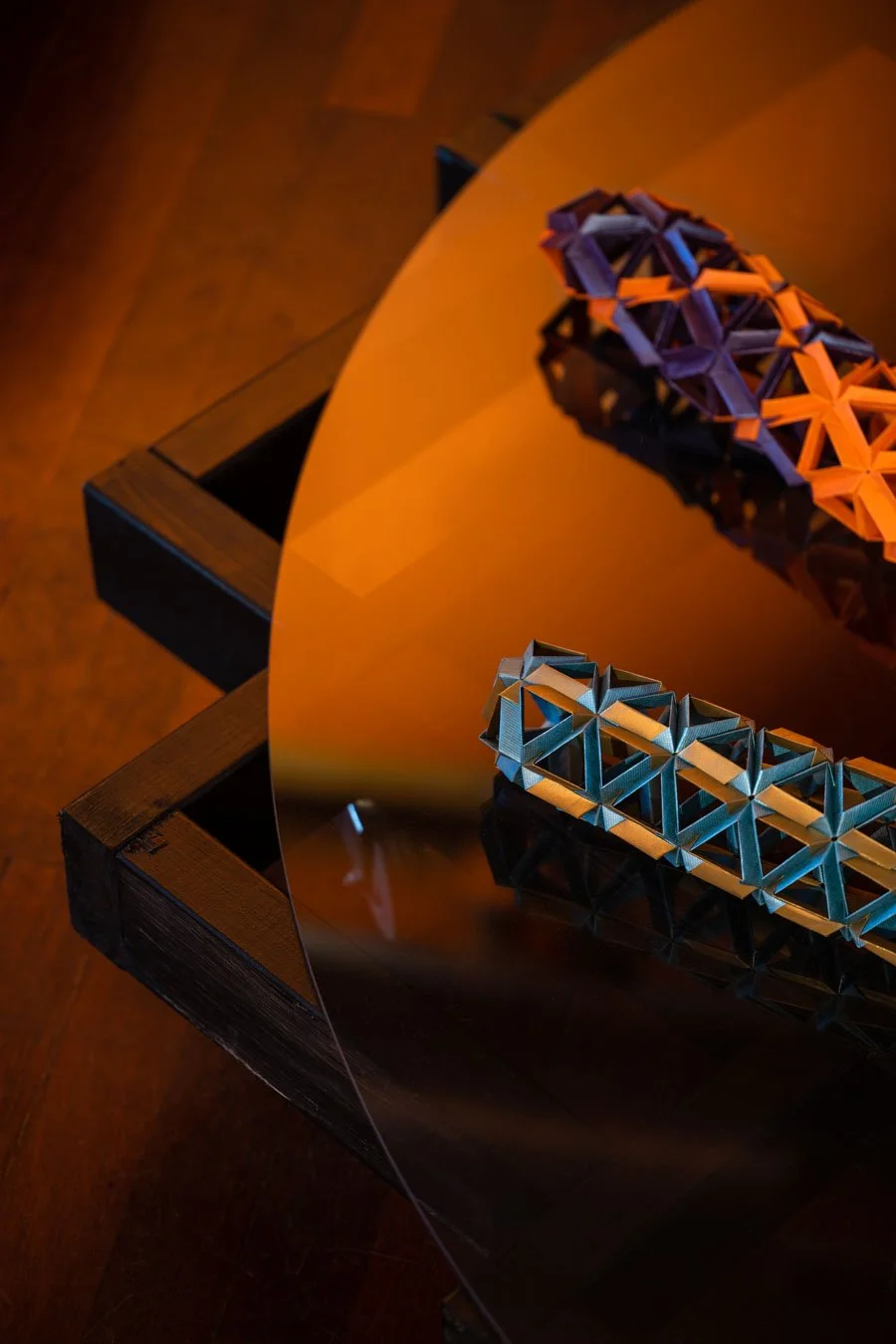 Hand folded metallic and fluorescent offset printed paper joints, black lumber, polarized plexiglass, wheels, wire mesh, spray paint, compressed foam